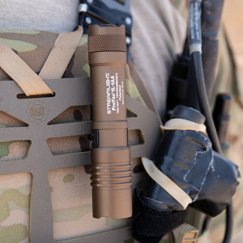 L'attuatore a cupola in gomma e la manopola di selezione rotante con bloccaggio a rotazione a 4 posizioni con indicatore tattile IR (o LED verde per la modalità tattica) offre un facile utilizzo anche indossando guanti pesanti