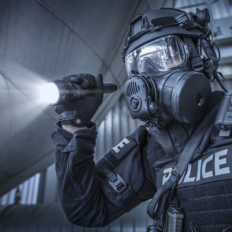 Gumowy siłownik kopułkowy i 4-pozycyjne, blokowane obrotowo pokrętło wyboru z dotykowym wskaźnikiem IR (lub zieloną diodą LED w trybie taktycznym) zapewnia łatwą obsługę nawet w ciężkich rękawicach